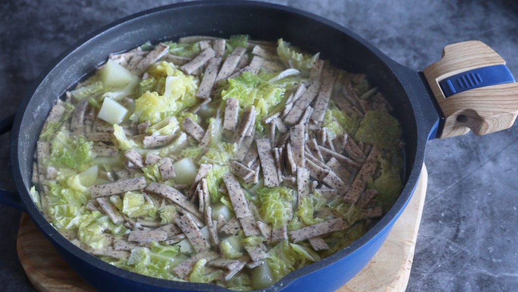 Nach der Kochzeit die Pizzoccheri hinzufügen, erneut aufkochen lassen und weitere 10 Minuten kochen.