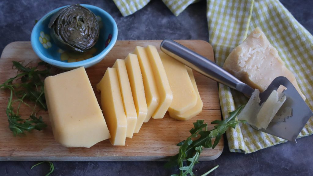 Nach Ablauf der Zeit holen Sie die Polenta aus der Heißluftfritteuse, legen Sie sie in eine Form und würzen Sie sie mit zuvor gekochten und in Scheiben geschnittenen Artischockenstücken und darüber mit dünnen Parmesanscheiben.
