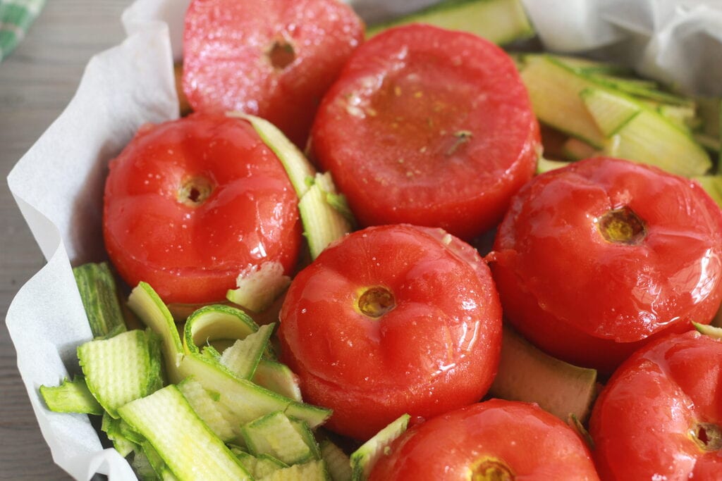Waschen Sie die Tomaten, schneiden Sie die obere Kappe ab und höhlen Sie die Tomaten mit einem Löffel aus. Behalten Sie das Fruchtfleisch und lassen Sie die ausgehöhlten Tomaten kopfüber etwa eine halbe Stunde abtropfen. Hacken Sie nun das Tomatenfruchtfleisch mit dem Knoblauch und der Hälfte des Basilikums, fügen Sie den Reis, das Salz, den Oregano, das native Olivenöl extra und das restliche Basilikum hinzu. Füllen Sie die Tomaten mit dieser Mischung, legen Sie sie auf das mit Backpapier ausgelegte Blech. Schneiden Sie die Zucchini mit der Mandoline in Scheiben und legen Sie sie neben die Reis-Tomaten, würzen Sie sie mit Salz und Öl.