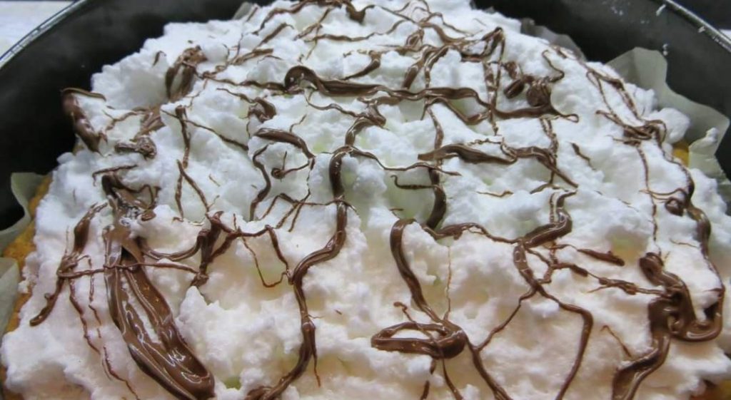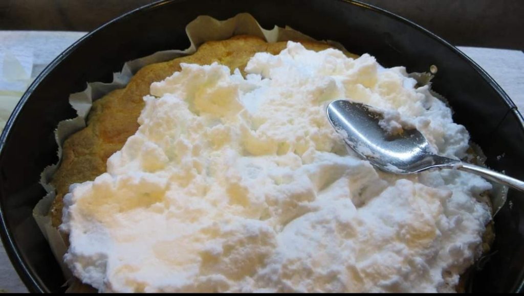 So verteile ich das Baiser über den bereits gebackenen und auf Raumtemperatur abgekühlten Ricciolina-Kuchen.