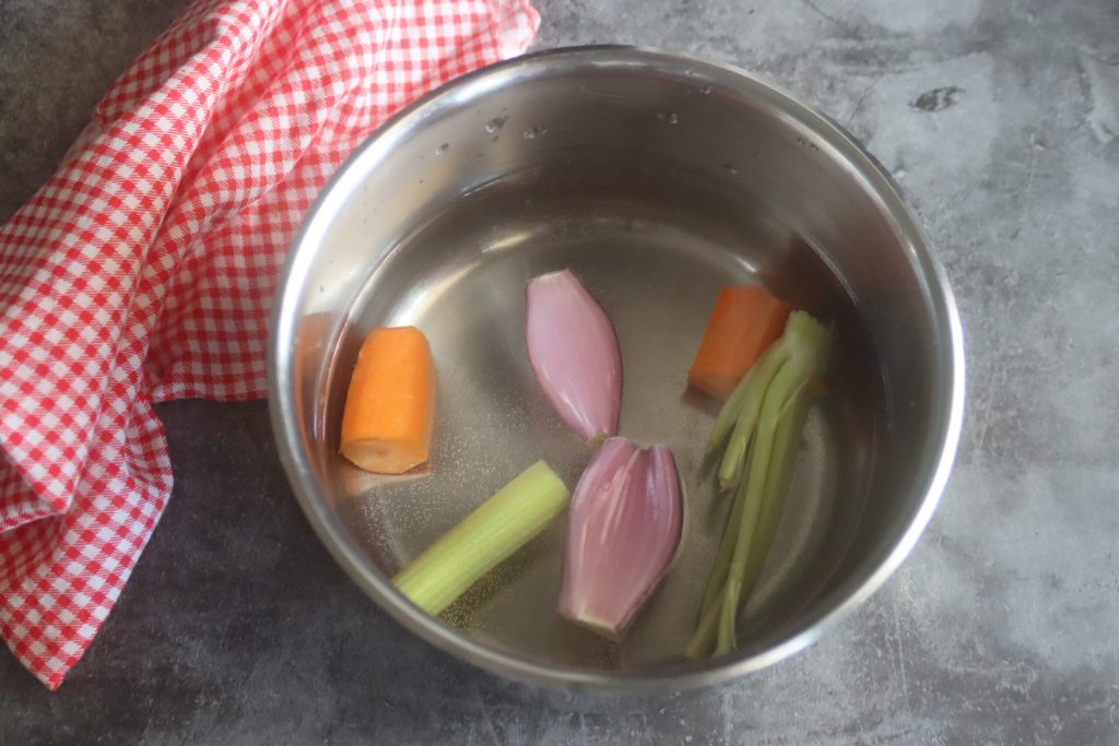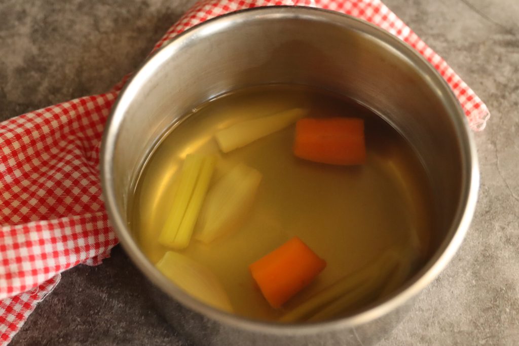 Um eine Gemüsebrühe vorzubereiten, benötigen Sie nur ein Stück Karotte, eine Schalotte und einen kleinen Selleriestängel. Kochen Sie sie etwa dreißig Minuten lang bei mittlerer Hitze.