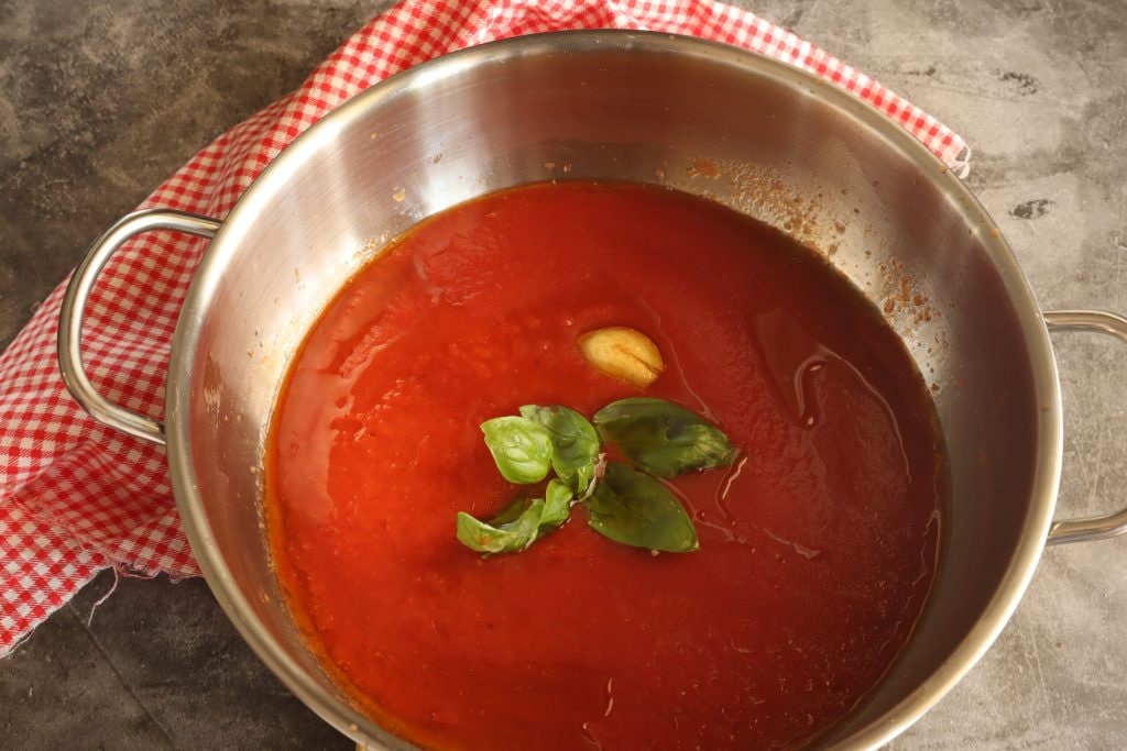 Wenn der Knoblauch goldbraun ist, fügen Sie die Tomaten und einige Basilikumblätter hinzu, würzen Sie mit Salz und kochen Sie zehn Minuten lang bei mittlerer Hitze.