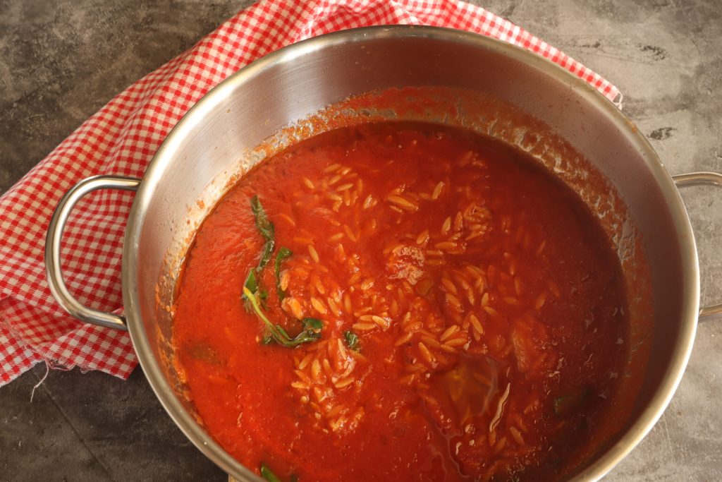 Geben Sie die rohen Risoni direkt in die Soße und verlängern Sie sie mit heißer Brühe oder heißem Wasser.