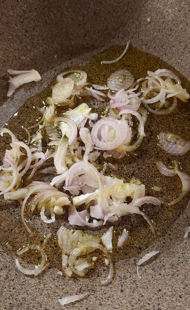 • Ich habe die Zwiebel dünn geschnitten und zusammen mit dem Olivenöl im Wok angedünstet.