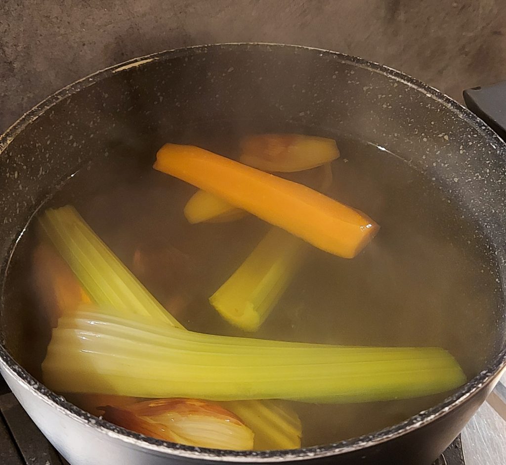 • Zuerst bereite ich in einem Topf die Gemüsebrühe mit Karotte, Sellerie und Zwiebel zu.
