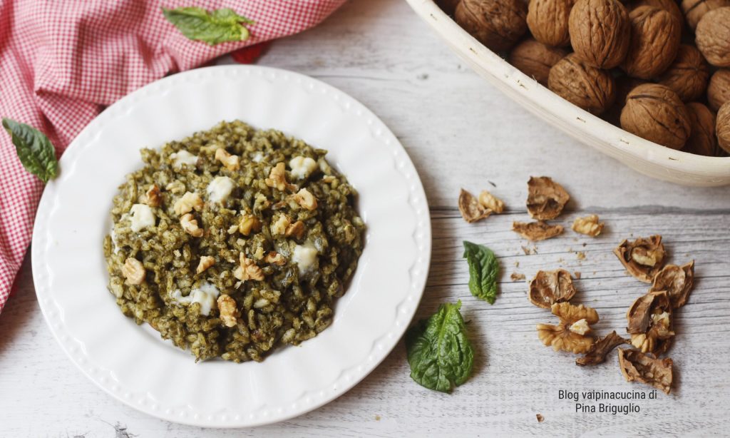 Risotto mit Spinat, Walnüssen und Stracchino, auch für eine ausgewogene Ernährung wird empfohlen, den Reis mindestens zweimal pro Woche zu konsumieren, ebenso wie alle anderen Lebensmittel, die uns zur Verfügung stehen. Abwechslung hilft uns definitiv. Risotto ist eines der Gerichte, das der Pasta in nichts nachsteht. Es gibt tausend Möglichkeiten, ein gutes Risotto zu machen. Ich benutze Carnaroli-Reis, eine hochwertige Sorte, die für dieses Gericht geeignet ist. Er ist vollmundig und behält gut die Konsistenz beim Kochen. Also kann man sich bei der Zubereitung eines guten Risottos austoben, mit Hülsenfrüchten, mit Fleischragout oder verschiedenen Soßen. Risotti mit Gemüse dürfen auch nicht fehlen, wie zum Beispiel das, das ich heute vorbereitet habe: Risotto mit Spinat, Walnüssen und Stracchino, und ich versichere Ihnen, es ist wirklich gut und gesund.