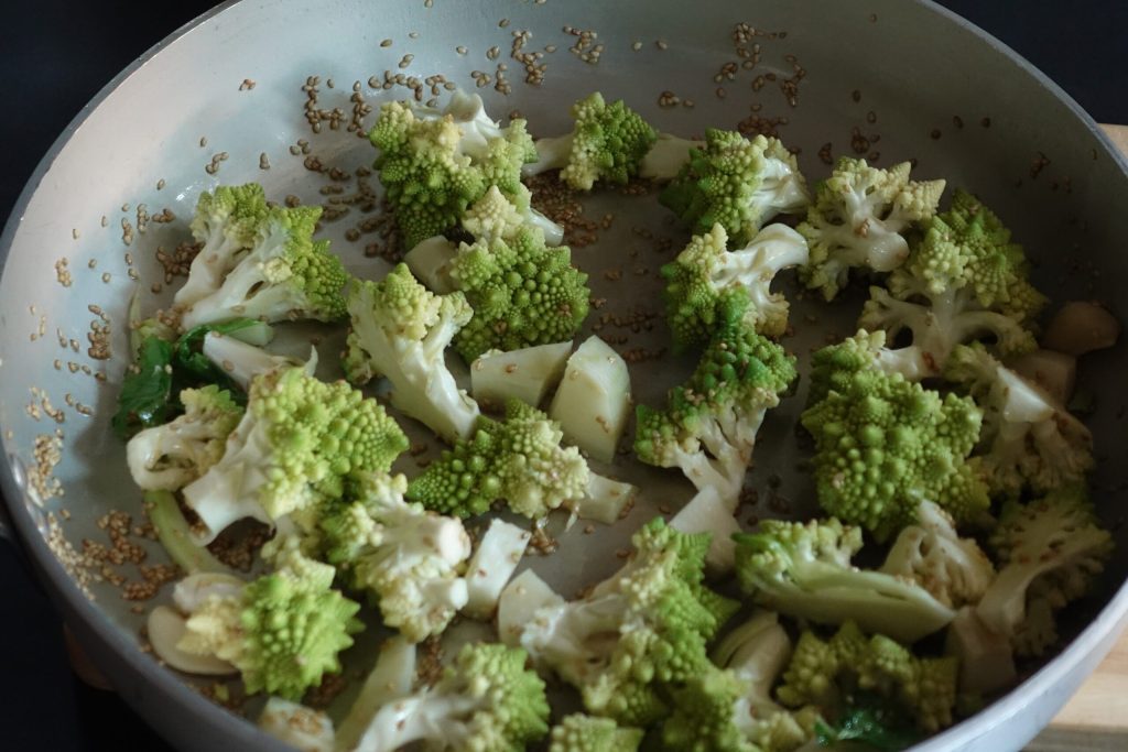 Ich putze und schneide den Brokkoli in Röschen und spüle ihn mehrmals gründlich ab. In der Zwischenzeit erhitze ich das Öl in der Pfanne mit dem Knoblauch und dem Sesam.