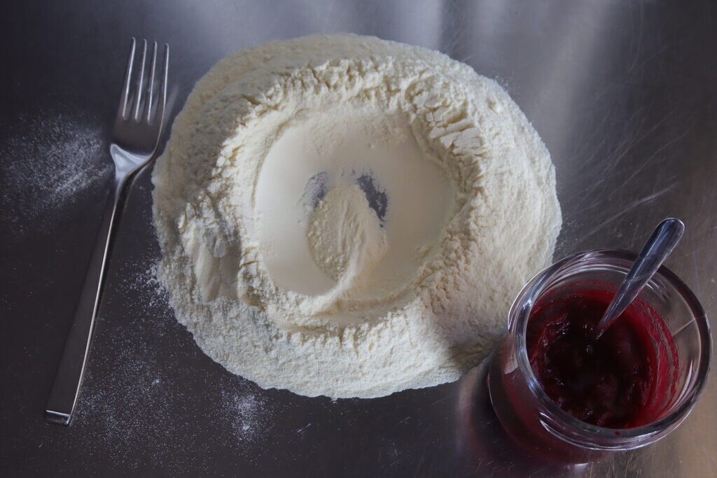 Auf dem Teigbrett das Mehl zu einem Hügel formen und in der Mitte eine Vertiefung machen.