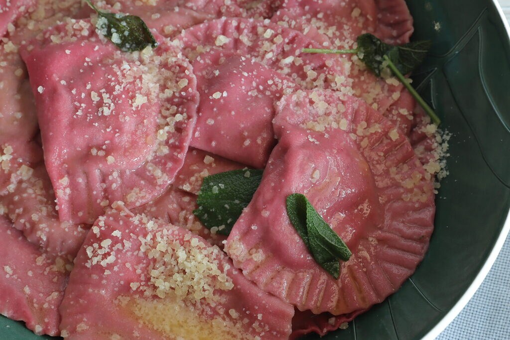 Rote Ravioli mit Butter und Salbei, eher intensiv violett würde ich sagen, da ich gekochte und im Mixer zu Püree verarbeitete Rote Bete verwendet habe. In unserer gastronomischen Tradition ist der König der Gerichte sicherlich die Pasta, der Hauptgang und nicht, wie viele glauben, die Vorspeise. Das ist mehr eine internationale Ableitung, die Vorspeise als ersten Gang einzuordnen. Die hausgemachte Pasta ist dann ein echtes Familienritual, das von Generation zu Generation weitergegeben wird. Hausgemachte Pasta zu machen ist eine alte Tradition, die es heutzutage immer schwieriger macht, vor allem für Frauen, die mit begrenzter Zeit arbeiten. Aber die Freude, hausgemachte dampfende Ravioli auf den Tisch zu bringen, ist immer noch eine große Befriedigung und, möchte ich hinzufügen, nicht wirklich schwierig.