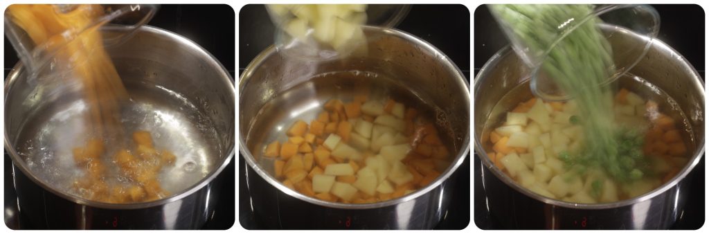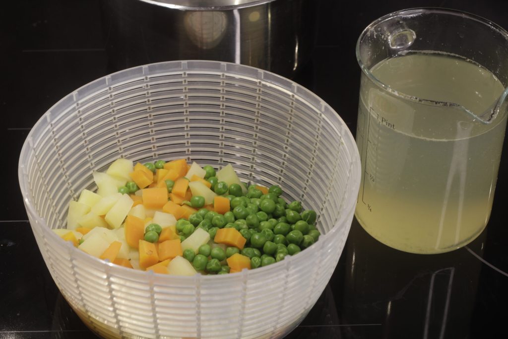 Überschreiten Sie die Kochzeit nicht, fünf Minuten sind wirklich ausreichend. Wie bereits oben erwähnt, schütten Sie das Kochwasser nicht weg, sondern verwenden Sie es für andere Zubereitungen. Lassen Sie die Kartoffeln, Karotten und Erbsen gut abtropfen und bei Raumtemperatur abkühlen.