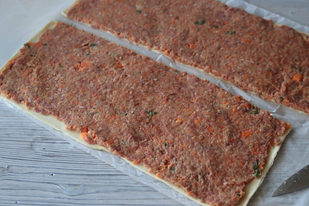 Schneiden Sie den Blätterteig mit Fleischfüllung der Länge nach in zwei Teile. Formen Sie zwei kleine Rechtecke.