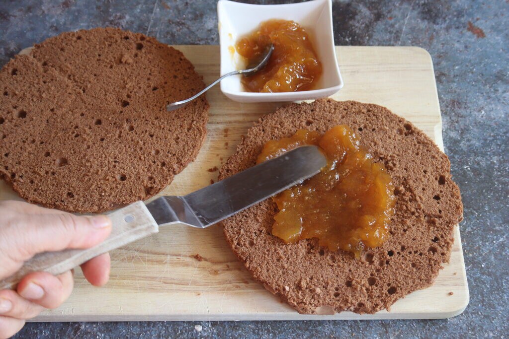 Teilen Sie den Kuchen in zwei Böden, verteilen Sie mit dem Spatel eine Schicht Aprikosenmarmelade über die gesamte Oberfläche der Sachertorte