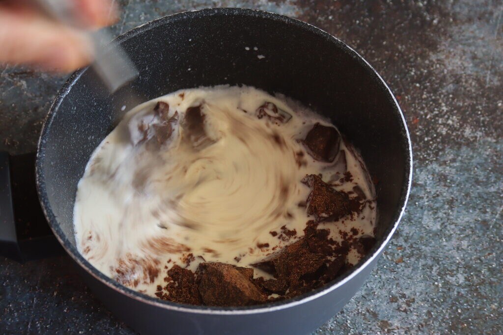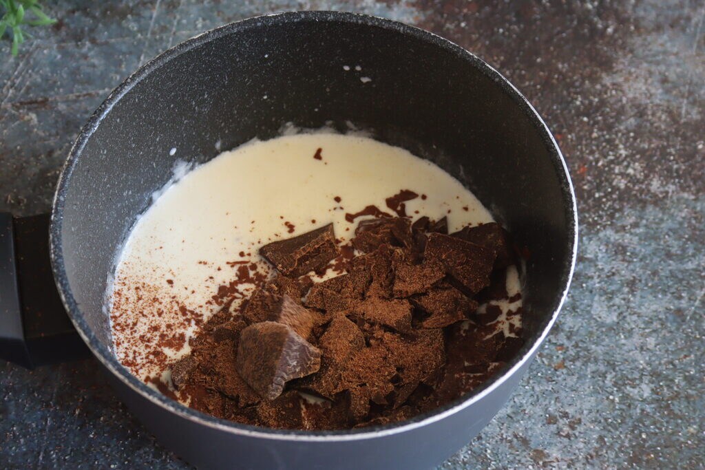 Nehmen Sie die Sahne vom Herd, sobald sie kocht, und geben Sie die geschnittene dunkle Schokolade hinzu.