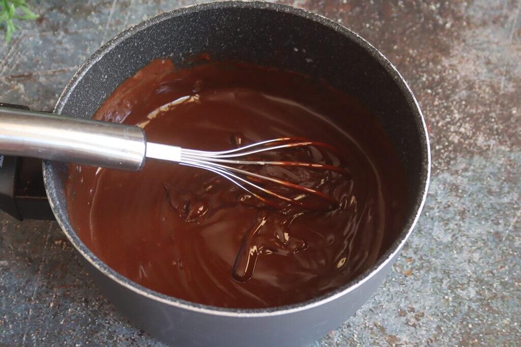 Mit dem Handrührgerät rühren Sie schnell um, bis die Schokolade vollständig geschmolzen ist und glänzend wird.