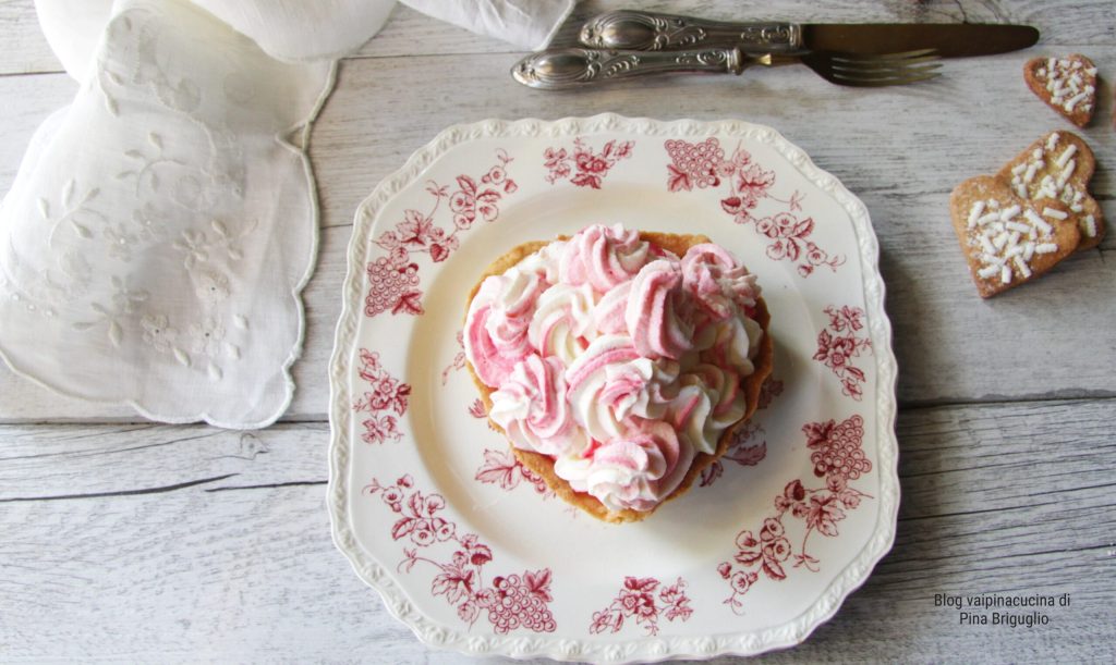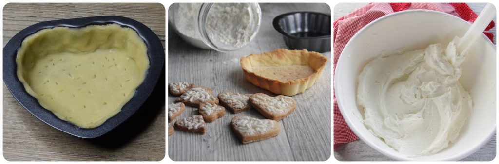 Den Mürbeteig in die herzförmige Form geben und im Ofen bei 180° 15 Minuten backen. Gut abkühlen lassen. Die clevere Creme ohne Kochen und ohne Eier zubereiten. Fügen Sie den Mascarpone und die Kondensmilch hinzu und schlagen Sie währenddessen die Sahne in der Küchenmaschine. Mit dem Spatel die Sahne mit dem Mascarpone und der Kondensmilch vermischen. Die Creme ist fertig. Füllen Sie den Spritzbeutel mit der cleveren Creme und lassen Sie in der Mitte sechs Tropfen rote Lebensmittelfarbe einlaufen. Bilden Sie Rosen mit dem Spritzbeutel in der kalten herzförmigen Mürbeteigform, indem sich die Farbe und die Sahne vermischen und ein Spiel von Streifenfarben entsteht.