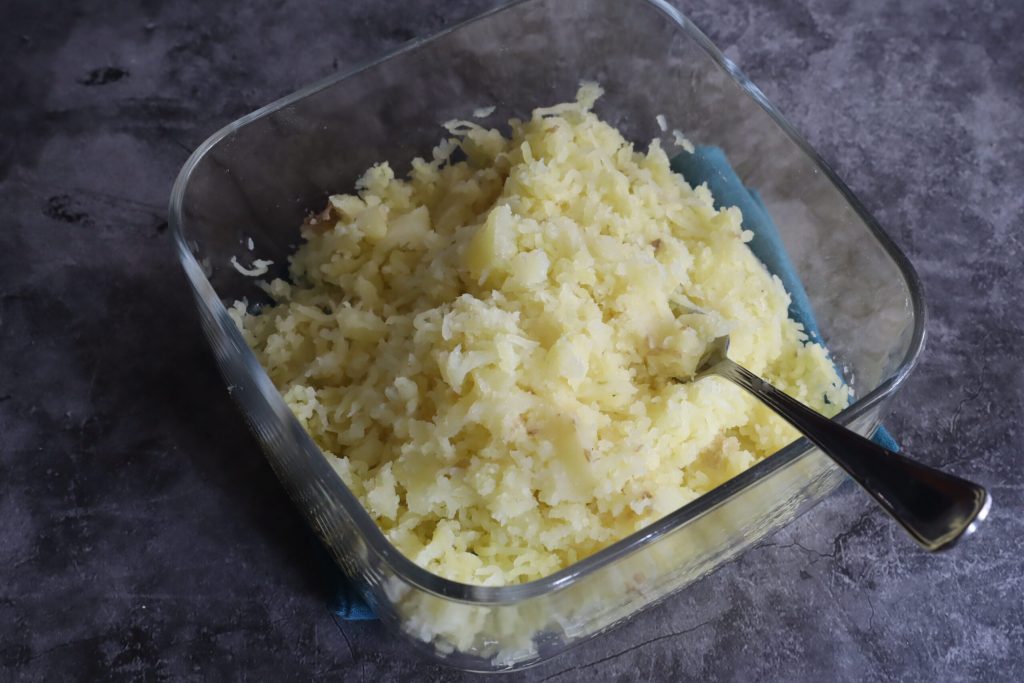 Drücken Sie die noch warmen Kartoffeln durch den Kartoffelstampfer und zerdrücken Sie sie zu einem Püree. Würzen Sie sie mit Pfeffer und einer Prise Salz, fügen Sie das Ei mit dem Pecorino, Parmesankäse und den Semmelbröseln mit der frischen Minze hinzu.