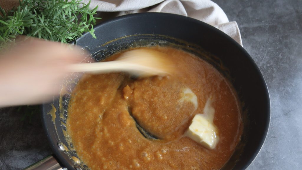 Fügen Sie die Butter hinzu und lassen Sie sie in den karamellisierten Zucker einarbeiten.