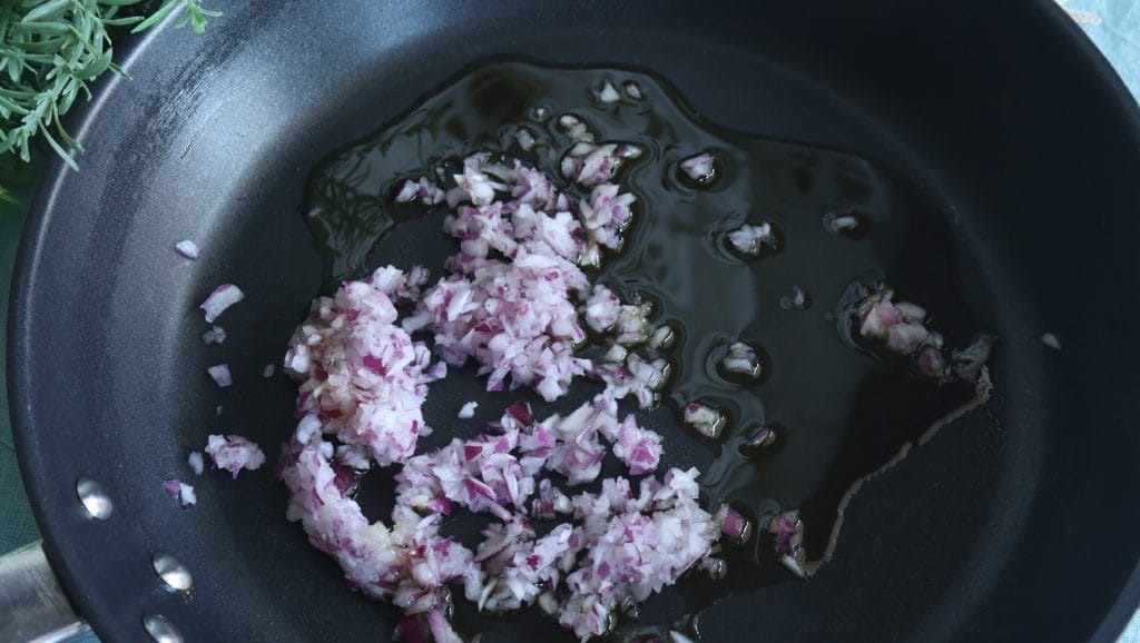 Hacken Sie die Zwiebel und bräunen Sie sie in der Pfanne mit dem Olivenöl an, ohne sie zu verbrennen, sondern einfach nur zu dünsten.