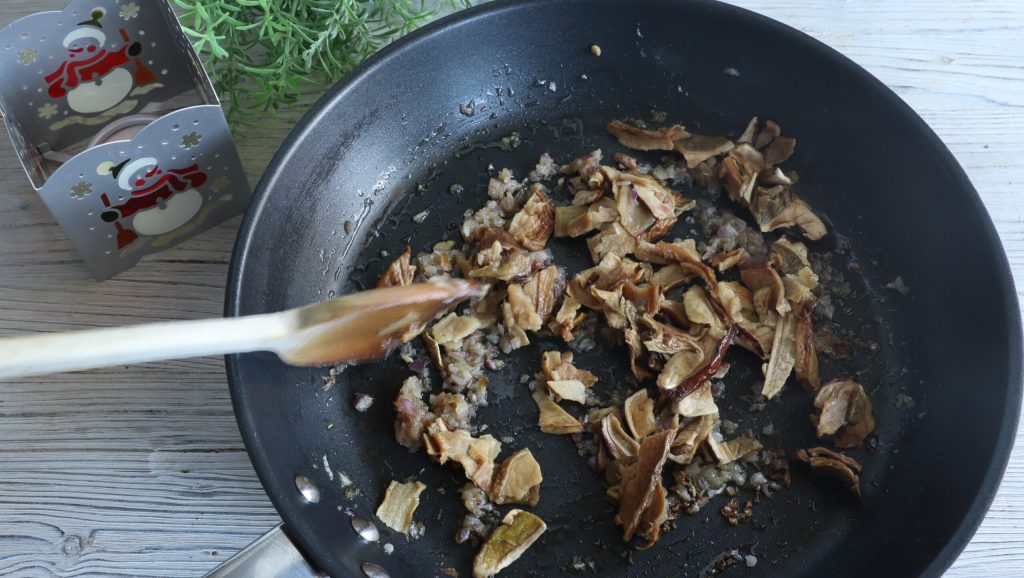 Fügen Sie die aufgeweichten, in Stücke geschnittenen Pilze und die tiefgefrorenen Erbsen hinzu, ohne sie aufzutauen, es reicht, wenn Sie sie eine halbe Stunde vorher aus dem Gefrierfach nehmen.