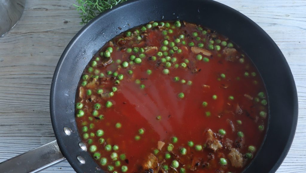 Kochen Sie das Wasser mit dem Tomatenmark und geben Sie es in die Pfanne zu den Pilzen und Erbsen.