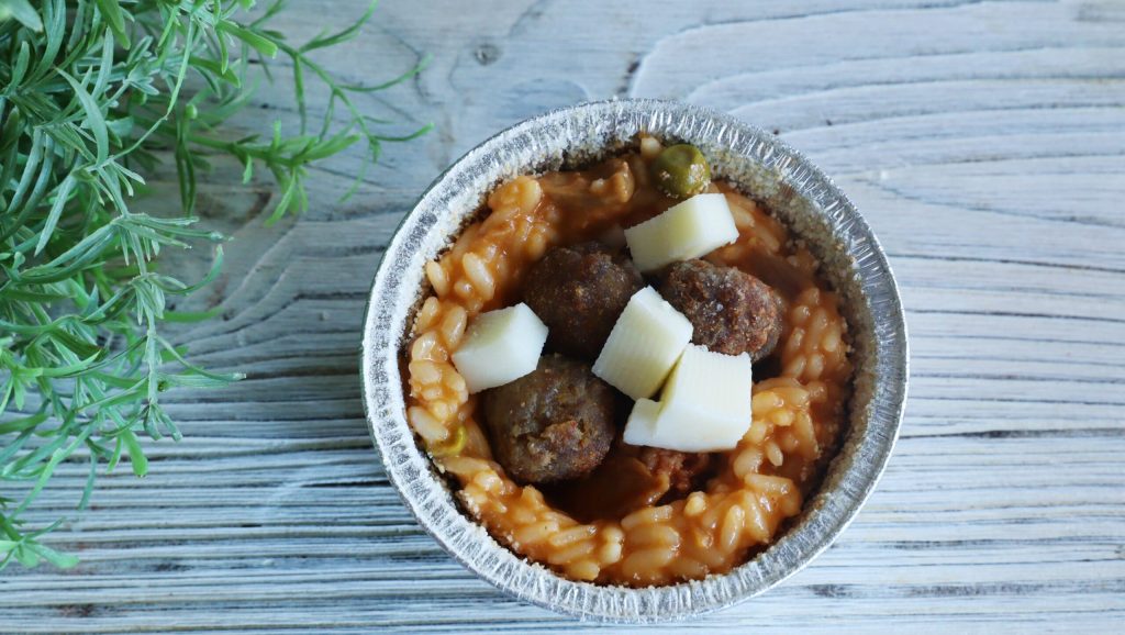 Verteilen Sie im Förmchen zwei Esslöffel Reis, in der Mitte geben Sie einen Esslöffel Erbsen mit Pilzen und Wurst, drei Fleischbällchen und Stückchen von Provola.