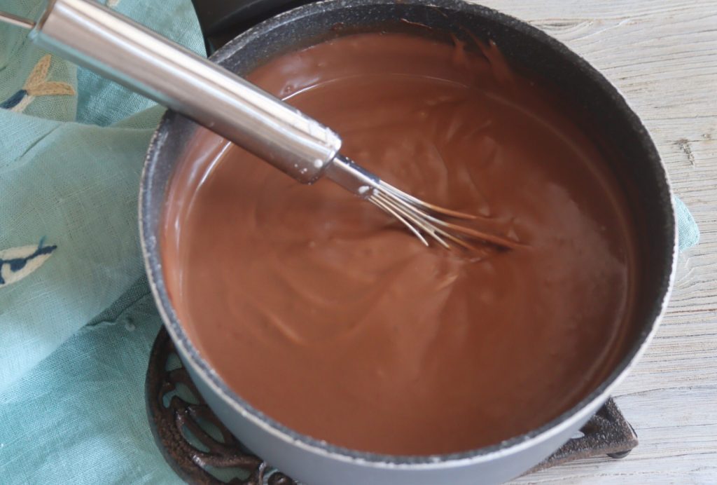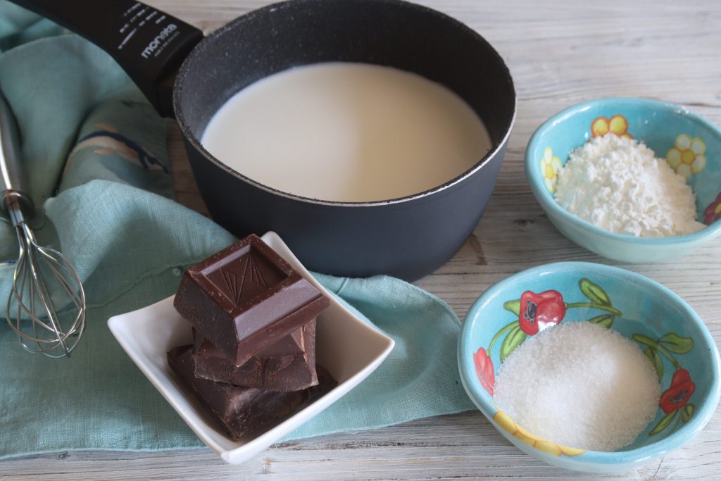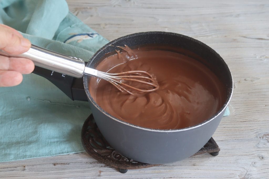 • Zucker und Maisstärke zusammen mischen und mit der kalten Milch vermengen. Auf den Herd stellen und bei niedriger Hitze erwärmen. Die dunkle Schokolade hinzufügen und weiter rühren.