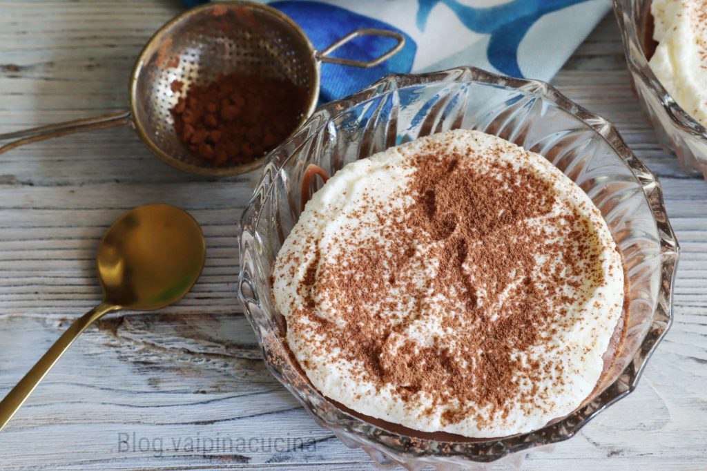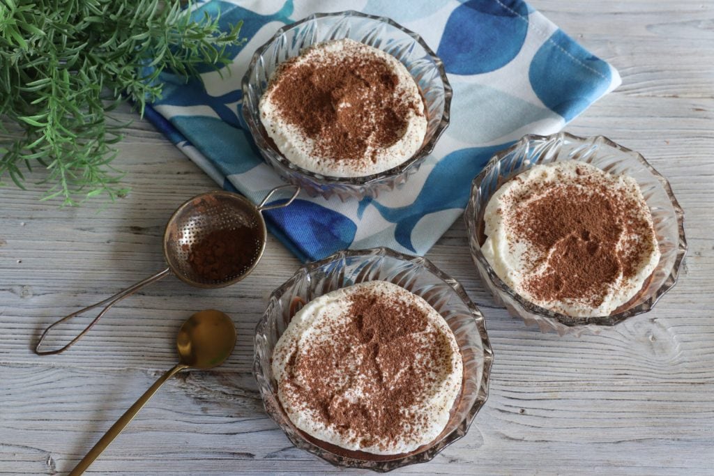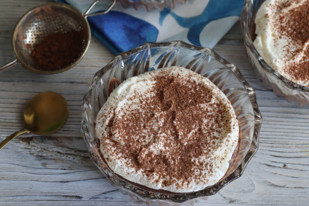 • Mit ungesüßtem Kakao bestäuben und die Schokoladen- und Sahnemousse servieren.