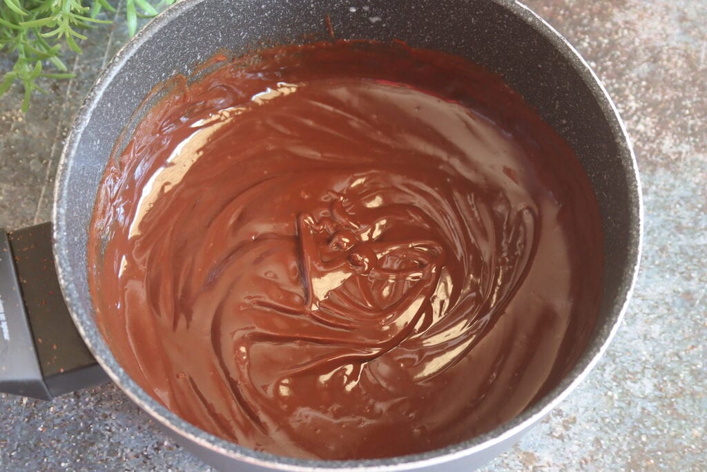 • Ich bereite sofort die Ganache vor, um die Schokoladentrüffel zu überziehen. Ich bringe die Sahne zum Kochen und nehme den Topf von der Wärmequelle, füge die in Stücke geschnittene dunkle Schokolade hinzu.