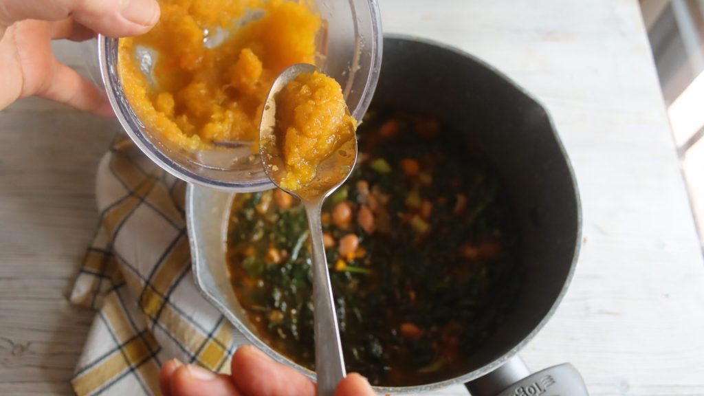 • Fügen Sie die zuvor zerkleinerte Karotten-, Zwiebel- und Selleriecreme hinzu.