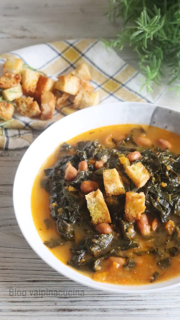 Schwarzkohlsuppe mit ungesalzenen Brotcroûtons, wie man in der Toskana sagt, mit Rosmarin gebraten, eine Köstlichkeit, glaubt es mir. Der Schwarzkohl, bekannt als toskanischer Kohl oder Palmkohl, weil die Blätter wie Palmwedel angeordnet sind, hat keinen typischen Kopf wie andere Kohlsorten. Man findet ihn auf dem Markt im Spätherbst oder frühen Winter. Leute, hier wird es kalt und ich habe auf dem Markt dieses Bündel Schwarzkohl gefunden. Da ich ihn sehr mag, habe ich ihn genommen, obwohl es leider auch der letzte der Saison ist. Ich denke, dass sie ab nächster Woche aus den Obst- und Gemüseständen verschwinden werden.