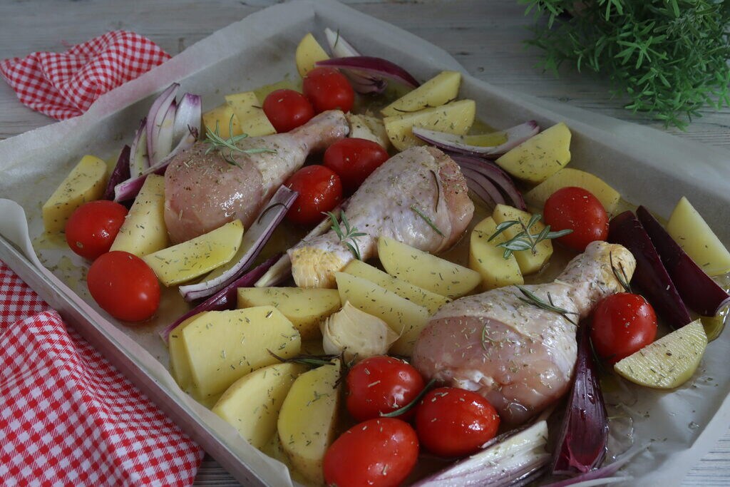 Im Backblech mit Backpapier habe ich die Hähnchenschenkel mit den Kartoffeln, den Kirschtomaten und den Zwiebeln mit Salz und Pfeffer, frischem und getrocknetem Rosmarin, nativem Olivenöl extra und Weißwein gewürzt.