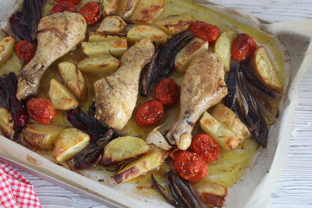 Eigentlich habe ich heute nur die Hähnchenschenkel gewählt, die immer von allen bevorzugt werden. Ich habe die Kartoffeln gewaschen und in Spalten geschnitten, die Kirschtomaten habe ich ganz gelassen, die Zwiebeln habe ich geputzt und in vier Stücke geteilt.