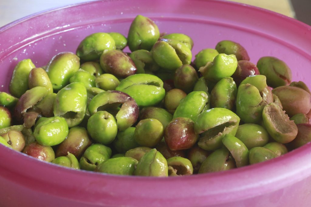 • Die zerdrückten Oliven sind bereit, entfernen Sie die Kerne und für das letzte Einweichen im Wasser fügen Sie Salz hinzu, genug, um sie würzig zu machen, lassen Sie es die ganze Nacht einwirken.