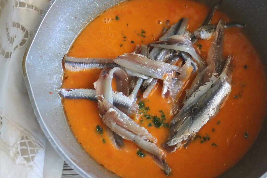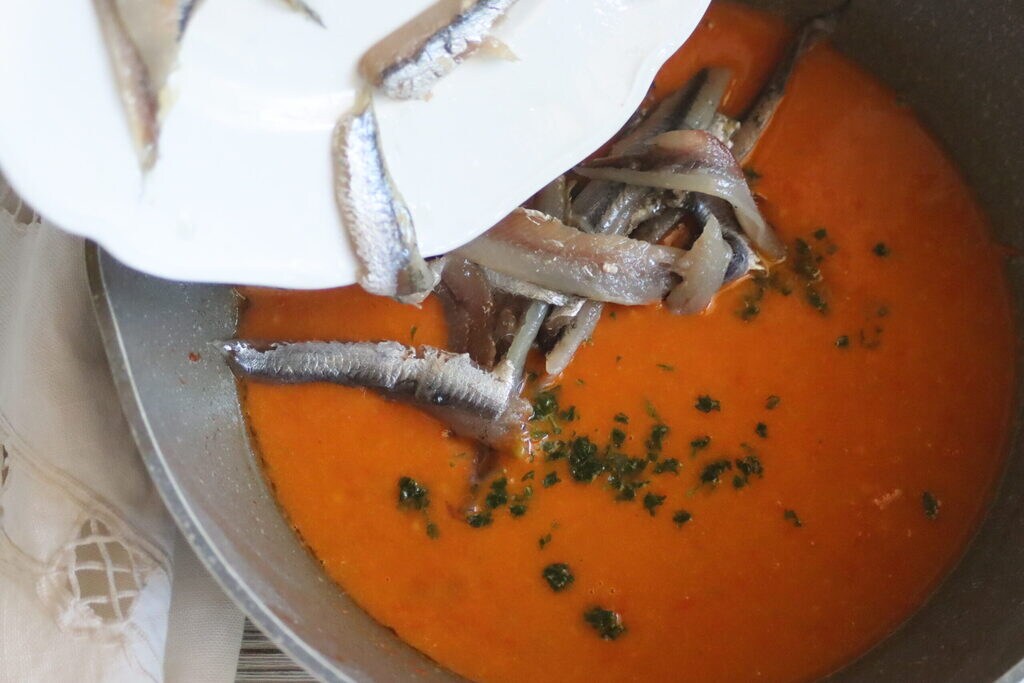 Geben Sie die Kirschtomatencreme wieder auf den Herd und fügen Sie die Sardellen hinzu.