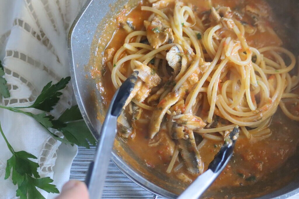 Spaghetti und Sardellen alla Marinara oder etwas Ähnliches, immer auf meine Art, manchmal halte ich mich nicht an die Regeln und meine Gerichte sind immer improvisiert, basierend auf dem, was ich in der Speisekammer habe. Wie meine Nichte sagt, sind sie „variabel“, das heißt, sie variieren jedes Mal je nach den Zutaten, die ich habe. Heute habe ich dieses Hauptgericht mit den Sardellen zubereitet, die ich im Gefrierfach hatte. Es waren zu wenige, um ein zweites Gericht zuzubereiten, und so habe ich die Gelegenheit genutzt, dieses schmackhafte und superschnelle Gericht zuzubereiten.