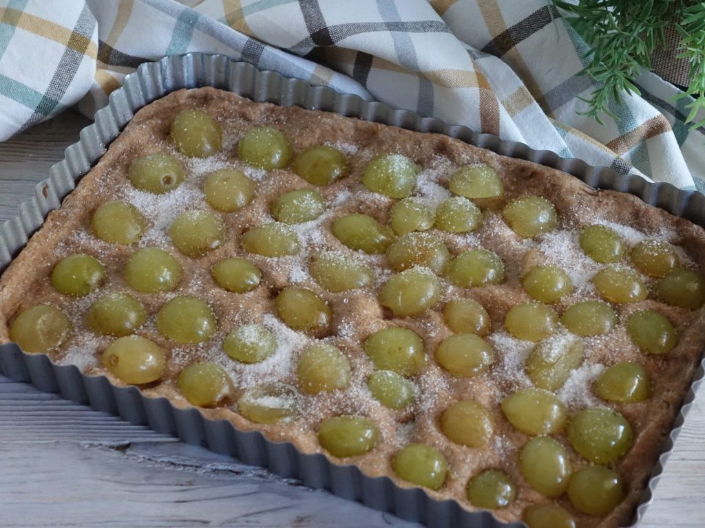 Süßes Septemberfladenbrot, eine niedrige weiße Pizza oder Focaccia mit viel schwarzen Trauben oben drauf, natürlich konnte ich es nicht lassen, es mit Vollkornmehl und weißen Trauben zu machen. Man nennt es Widerspruchsgeist. Das süße Septemberfladenbrot, weil ich es weder Pizza noch Focaccia nennen kann, es ist nicht salzig, aber auch nicht sehr süß mit nur 3 Esslöffeln Zucker, September, weil dies die Zeit der Trauben ist, reif, reichlich vorhanden und sehr süß.