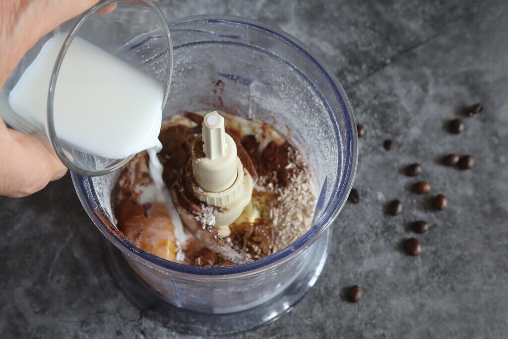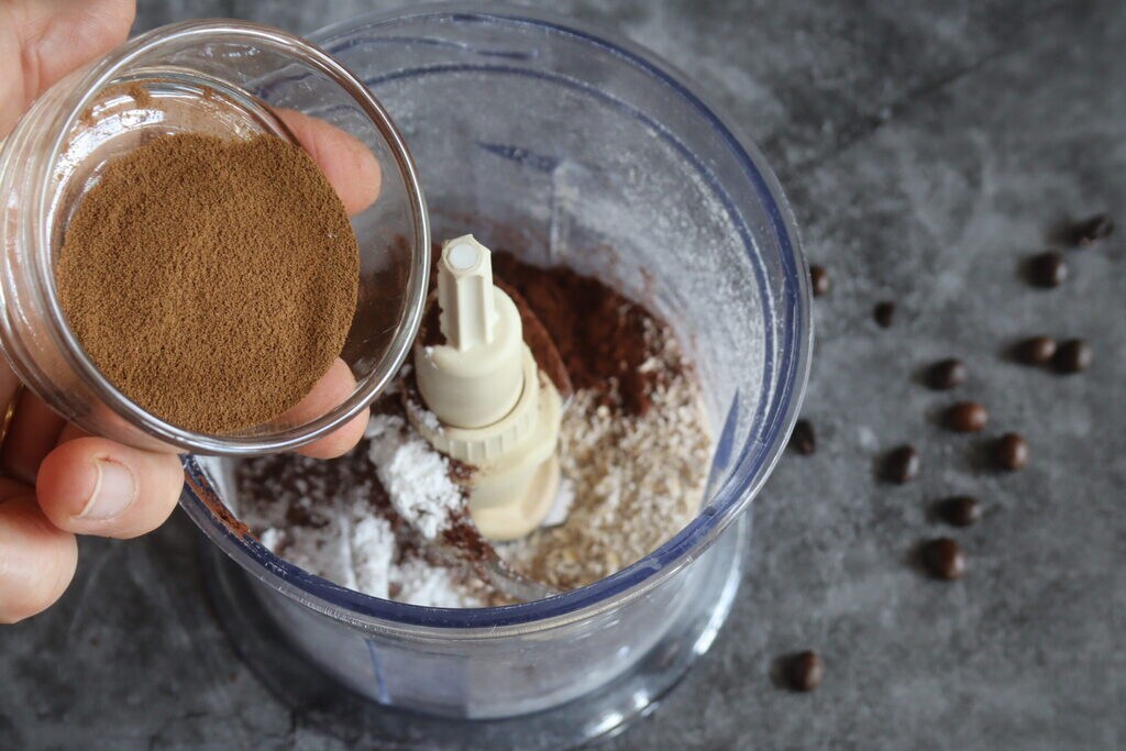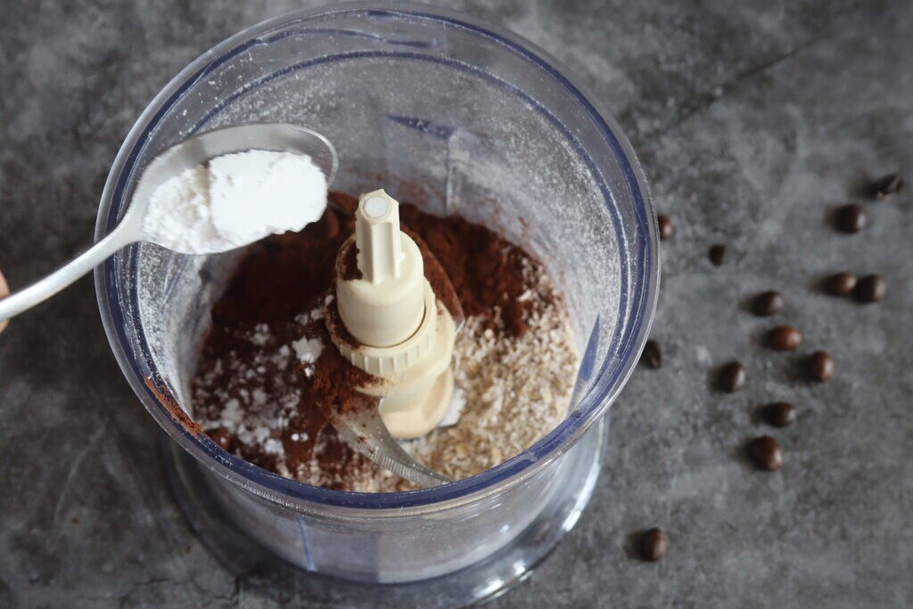 Dann füge ich im Zerkleinerer das ungesüßte Kakaopulver hinzu