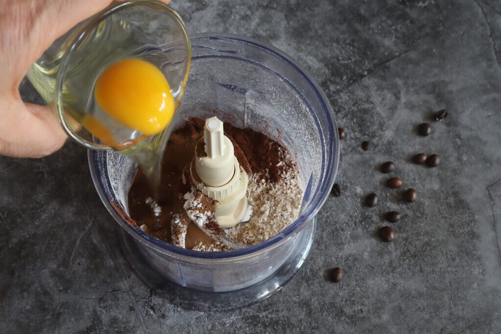 Zur Zubereitung des Tassenkuchens mit Haferflocken und Kaffee benötigst du einen Zerkleinerer, um alle Zutaten zu mischen. Im ersten Schritt zerkleinere ich die Haferflocken zu Mehl.
