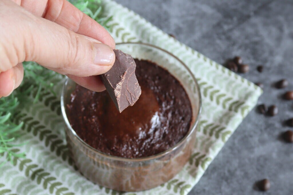 Entferne die Tasse aus der Mikrowelle und gib ein Stück Schokolade in die Mitte, drücke es tief hinein.