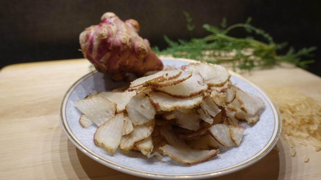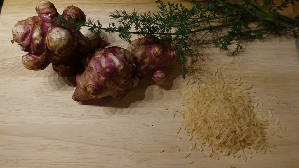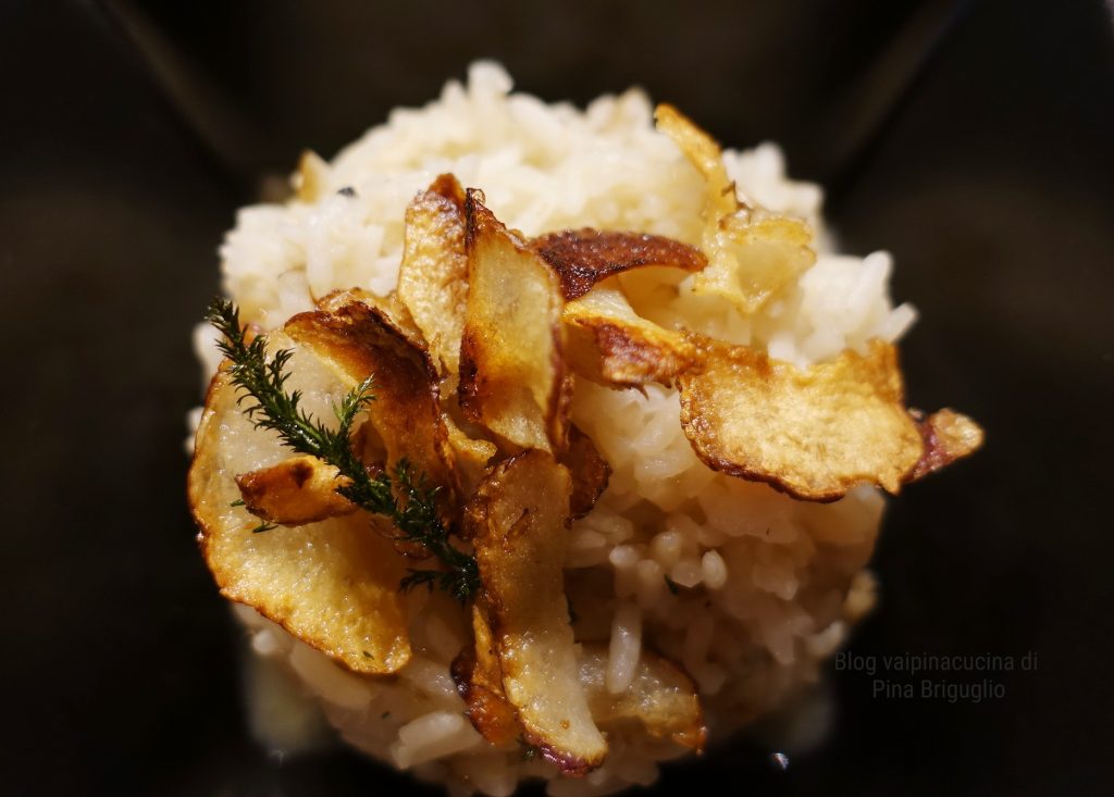 Topinambur-Risotto, ein sehr einfaches Gericht mit wenigen Zutaten. Heute bereite ich das Risotto mit Topinambur-Chips zu, um Knusprigkeit zu erhalten. Natürlich kann man den Topinambur auch im Hausgarten anbauen, es braucht wenig, die Pflanze ist sehr robust und abgesehen von Sonne und Wasser braucht sie nichts anderes, sagen wir, dass sie einem biologischen Zyklus folgt. Sobald der oberirdische Teil des Topinamburs, die gelben Blüten, vertrocknet ist, können die Knollen geerntet werden, und natürlich werden die kleineren Knollen im Frühjahr neue Triebe und Pflanzen hervorbringen, und der biologische Kreislauf setzt sich fort. Der Topinambur wird auch Jerusalem-Artischocke genannt (der Geschmack ähnelt sehr der Artischocke), deutsche Rübe oder kanadische Sonnenblume. In der Küche eignet er sich gut für Risottos oder im Ofen zusammen mit anderen Knollen als Beilage, aber ich glaube, er wird dafür und für vieles mehr verwendet, ich weiß, dass er im Piemont für Bagna Cauda und Fondue verwendet wird.