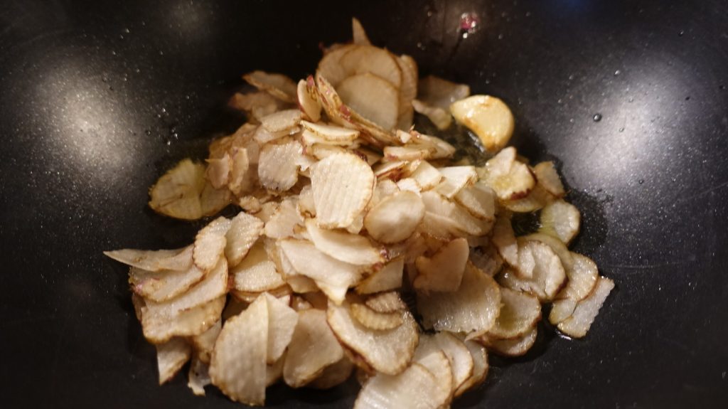Braten Sie den Knoblauch in wenig Öl an und fügen Sie sofort den Topinambur hinzu.
