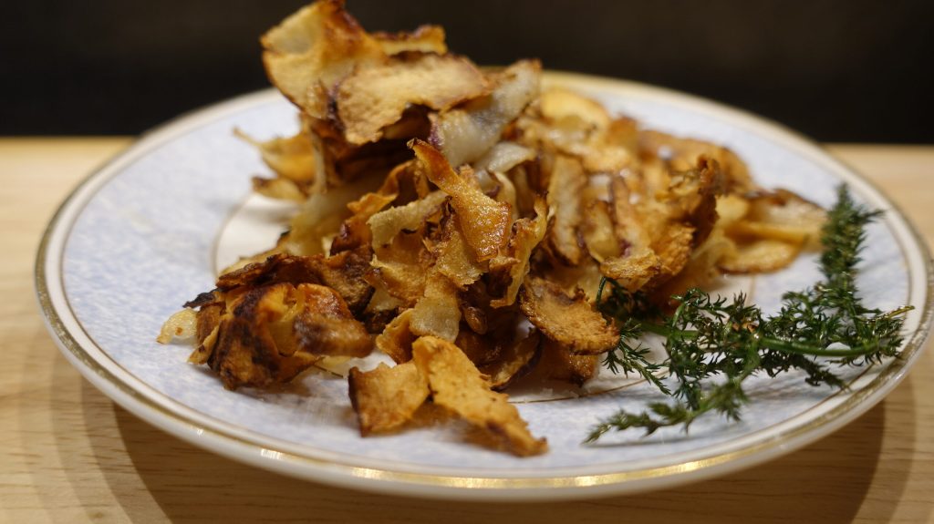 In der Zwischenzeit bereiten Sie mit einem Teil des in dünne Scheiben geschnittenen Topinamburs frittierte Chips zu. Ich habe die Heißluftfritteuse bei 195° für 7 Minuten verwendet, aber Sie können sie auch in der Pfanne mit Erdnussöl zubereiten.