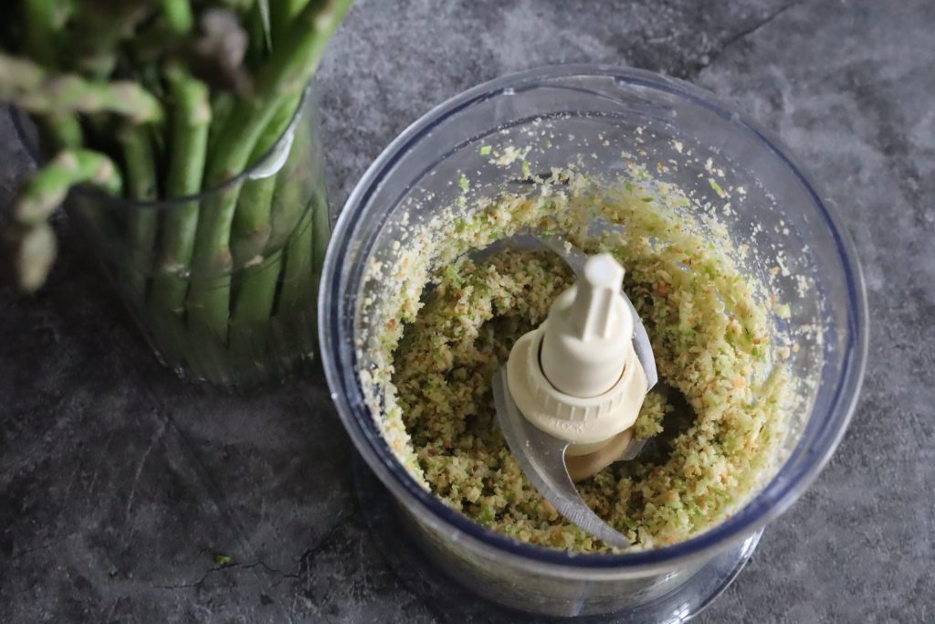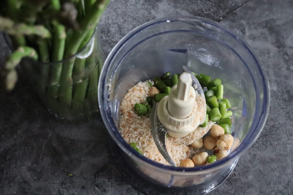 In das Glas des Zerkleinerers geben Sie die Haselnüsse mit den Semmelbröseln, dem Salz, dem Pfeffer und den in Stücke geschnittenen Endstücken des Spargels.