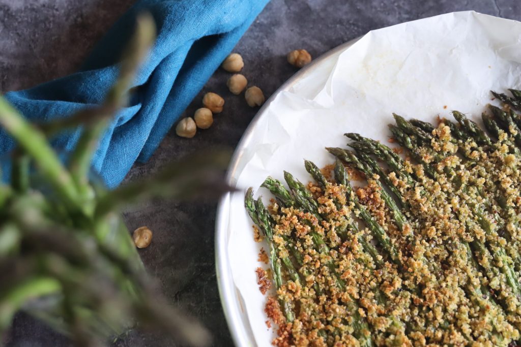 Servieren Sie die Beilage aus überbackenem Spargel mit Haselnüssen.