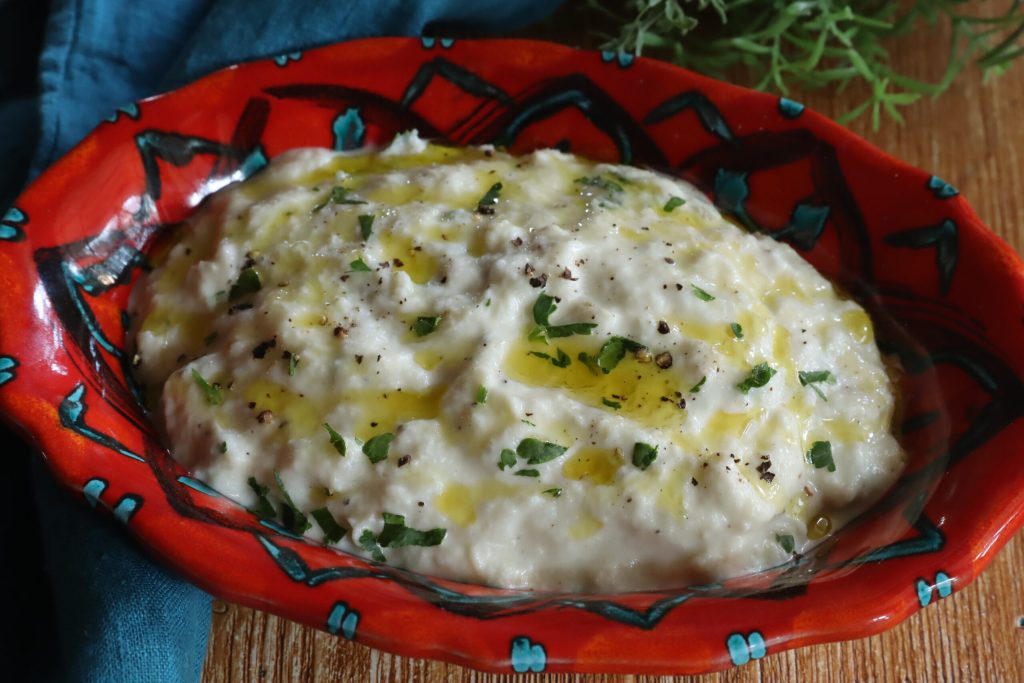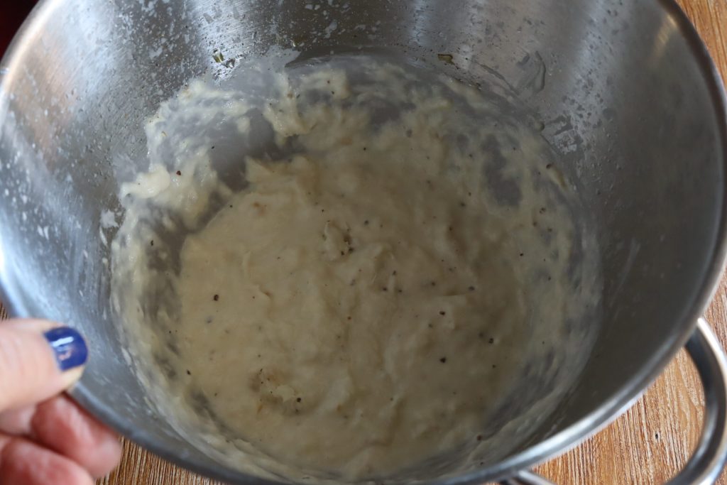 Als es fertig war, habe ich die Haut und eventuelle Gräten entfernt und den Stockfisch in der Küchenmaschine mit dem Rührhaken, einer geriebenen Knoblauchzehe und Öl in einem dünnen Strahl 10 Minuten lang aufgeschlagen, bis es cremig wurde.
