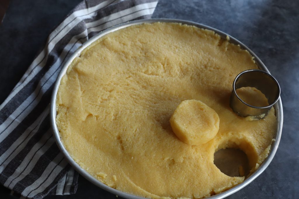 Mit einem 6 cm Ausstecher schneide ich Polentascheiben aus.