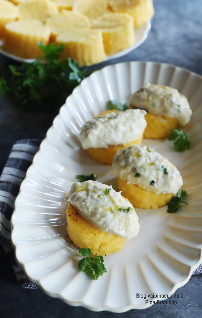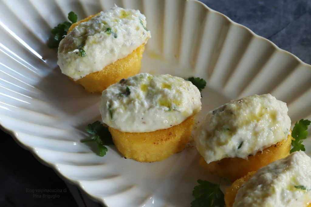 Ich bereite die Nocken mit dem Venezianischen Stockfischaufstrich vor und lege sie auf die gerösteten Polentascheiben.