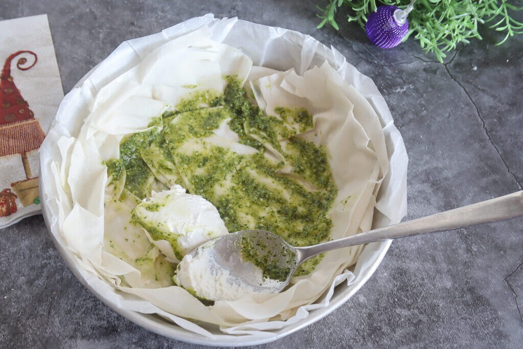 In einer runden Backform mit Backpapier beginne ich mit einer Schicht Filoteig. Mit dem Silikonpinsel streiche ich Pesto auf eine erste Schicht und füge ein weiteres Blatt hinzu. Neben dem Pesto verteile ich auch die Hälfte der Ricotta.