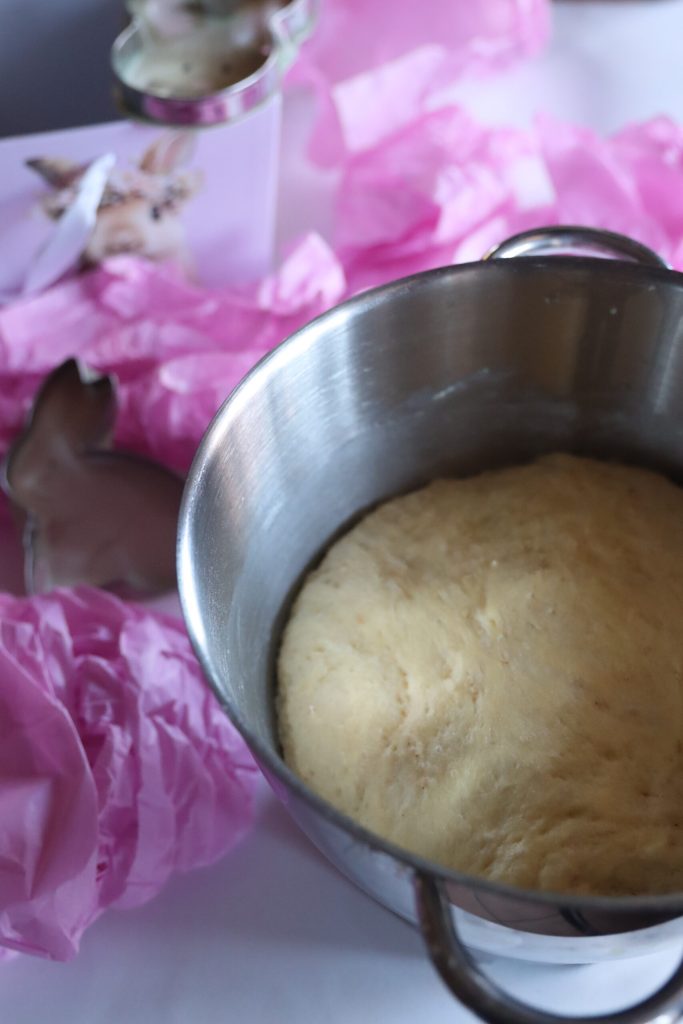 Ich nehme den Teig aus der Maschine und teile den inzwischen verdoppelten Teig in 8 Kugeln à 90 g.