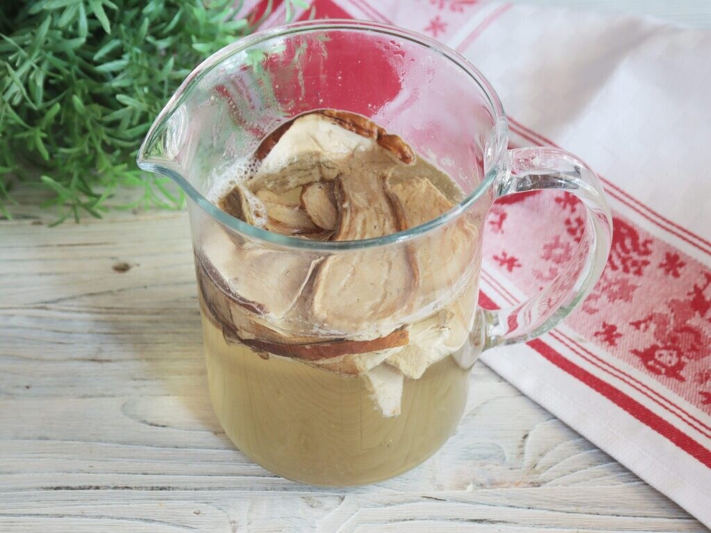 Die getrockneten Steinpilze 5 Minuten in heißem Wasser einweichen.